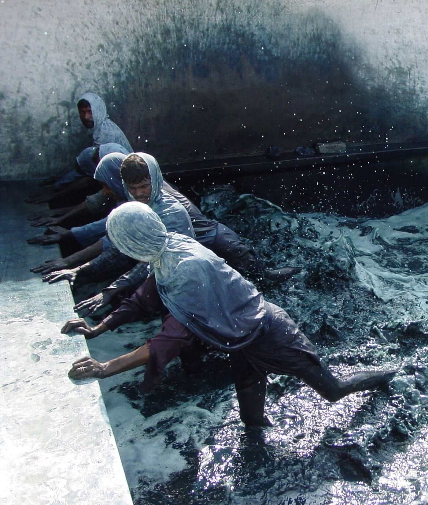 Indigofera tinctoria: indigo leaves-blue tones. Specialized in the art of natural indigo, our dyemasters cultivate regenerative vats. The indigo solution maintained in fermentation can extend its life to decades, keeping the natural indigo richness intact, eliminating waste water and mordants during the dyeing process. Indian natural dyers use myrobalan, tannins, and wood ash as mordants for all other colors.